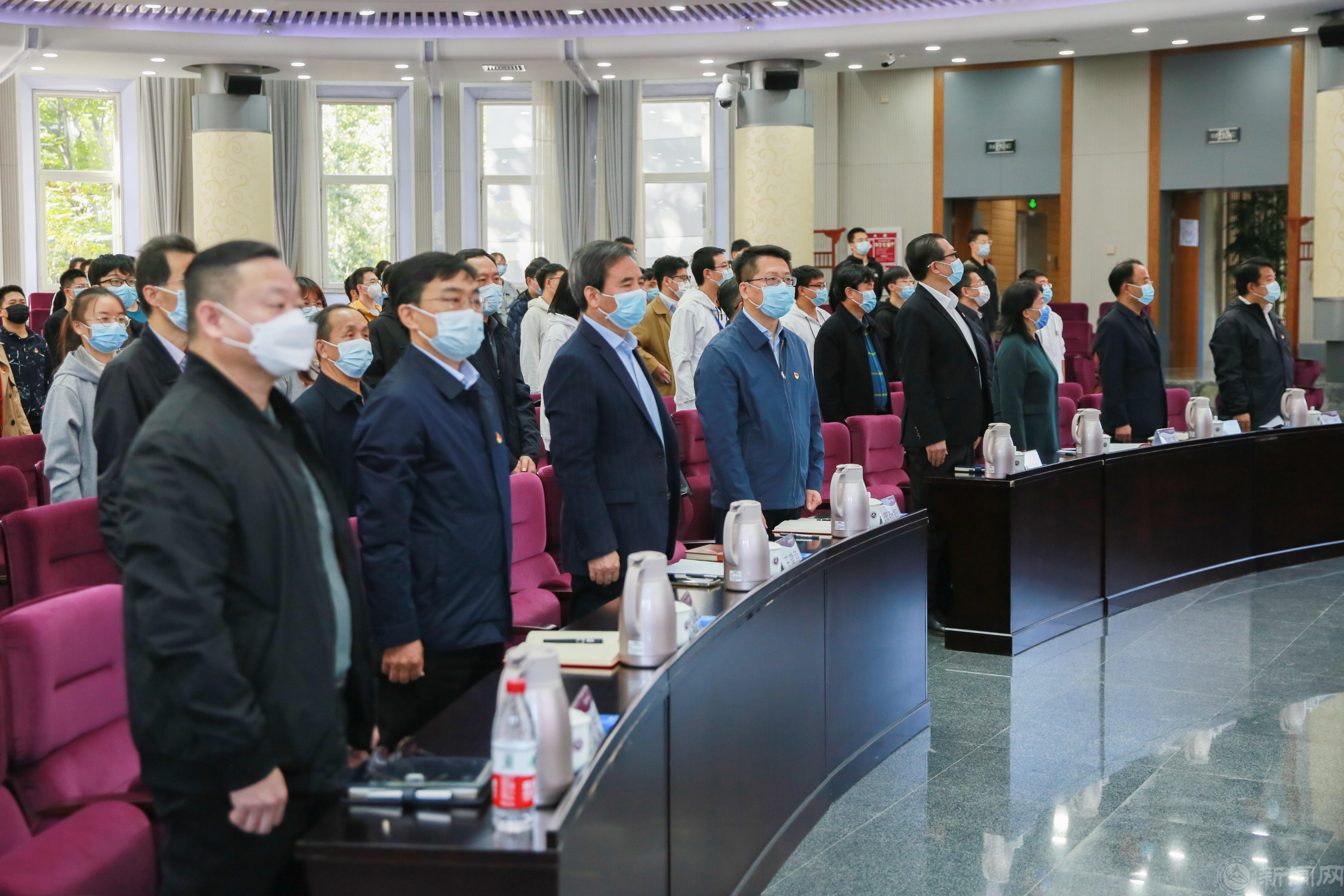 在广学楼报告厅主会场,学校领导班子成员,党委委员,与部分师生代表共同观看大会开幕式实况直播。