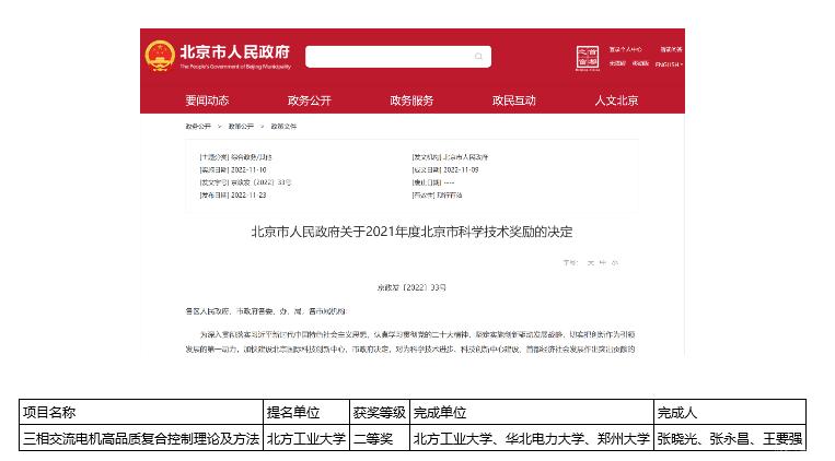 11月23日,北京市人民政府发布《北京市人民政府关于2021年度北京市科学技术奖励的决定》(京政发〔2022〕33号),beat365官网作为第一单位申报的“三相交流电机高品质复合控制理论及方法”获2021年度北京市自然科学奖二等奖。