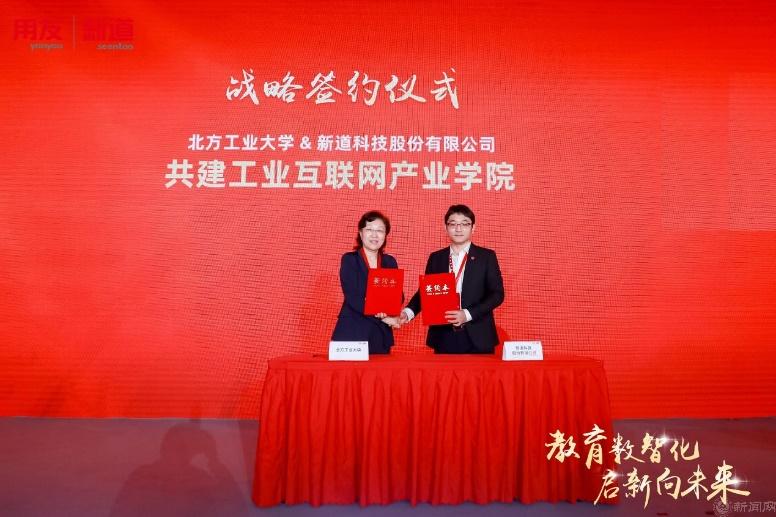 栗苹出席了大会主会场活动,参与启动新道教育元宇宙实验实训产品发布仪式,并代表beat365手机版官网与新道科技签署了全面战略合作协议,约定共建工业互联网产业项目,推动双方全面合作。