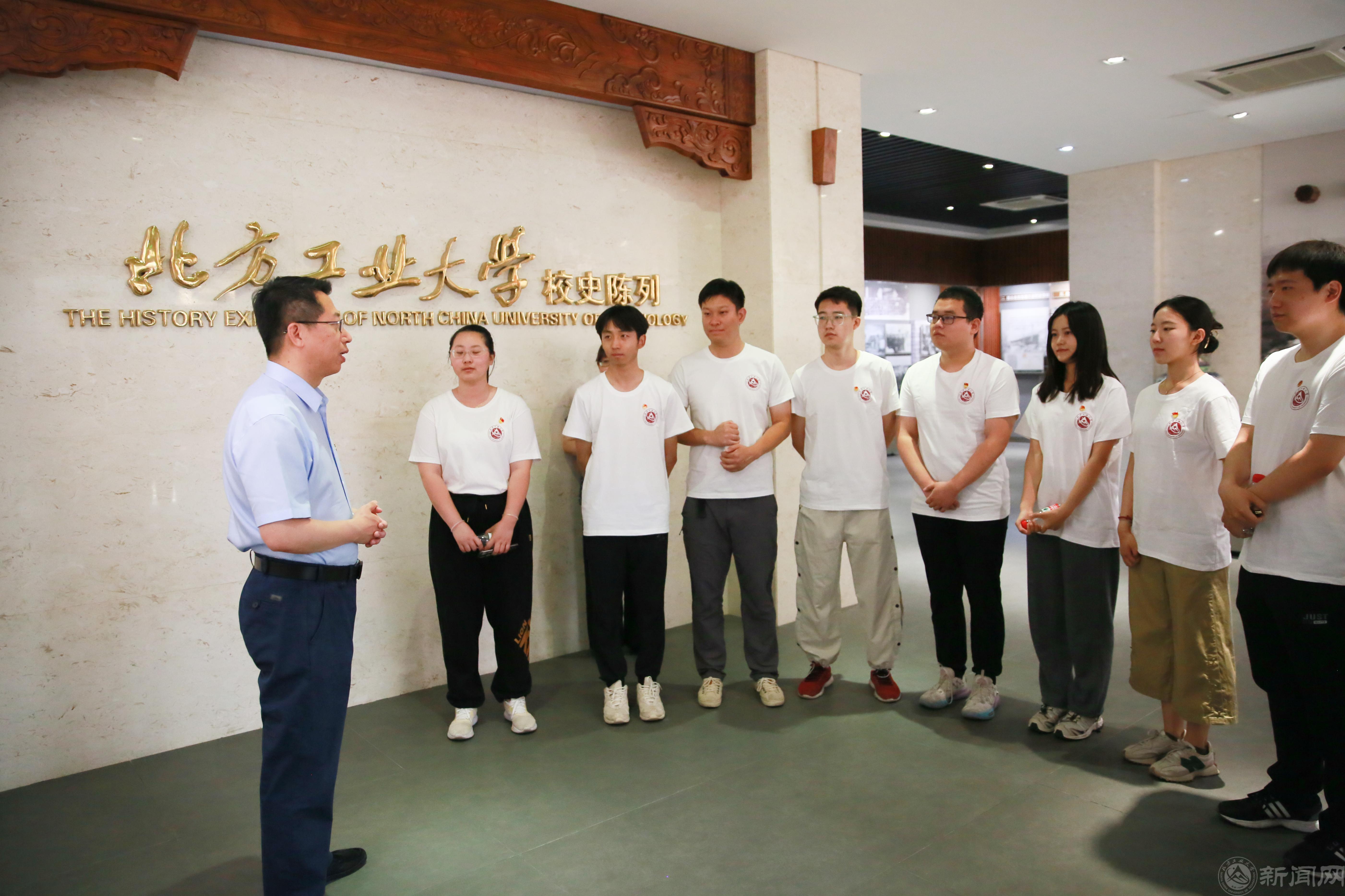 缪劲翔带领毕业生代表一起走进校史馆重温校史,共同回顾学校七十余载兴工报国路。缪劲翔指出,校史是学校成长发展的刻录,是校园文化精神的载体。他从“传承兴工报国精神”“追忆先贤光辉事迹”“青春建功新时代”三个方面,重点回顾了beat365官网在77年办学历程中,始终传承“工业报国、工业兴国、工业强国”的精神血脉,聚焦国家战略发展需要加快人才培养的奋斗历程;生动介绍了beat365官网首任校长陈光熙一片赤诚心向党、兴工报国育人才,齐东旭教授潜心钻研计算机图形学领域,科研精神薪火传,仇春霖先生打造美育研究高地、创工科院校美育先河的感人事迹;深情讲述了新时期北方工大人不忘初心使命,主动对接国家和北京市经济社会发展新要求,开启全面建设高水平应用型大学新征程的不懈努力,希望青年学生深入思考教育强国,青年何为,民族复兴,青年何为,坚定理想信念,敢于实干担当,争做时代新人。