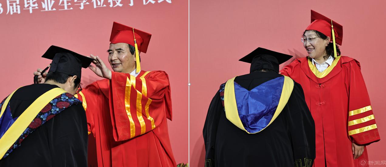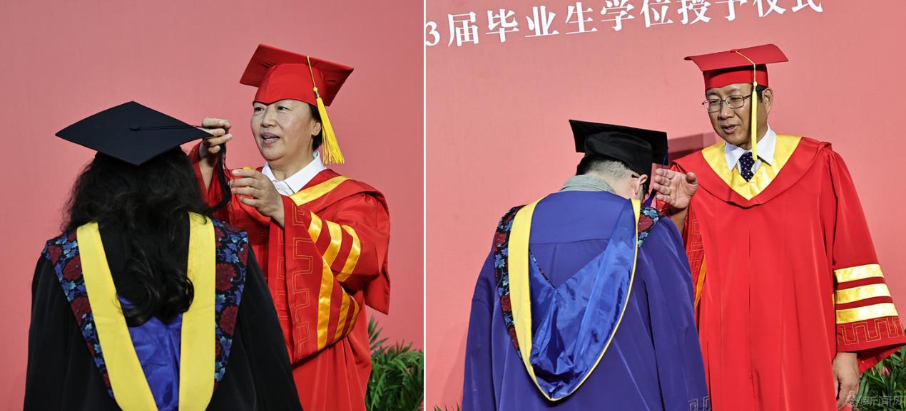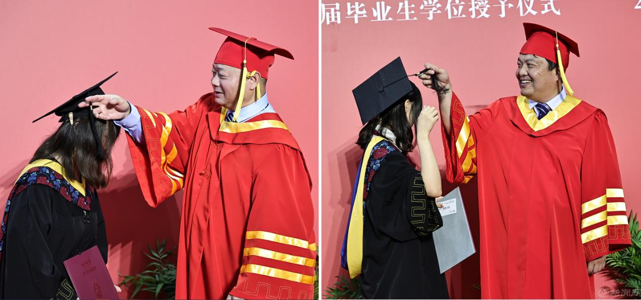 随后,学位授予仪式在体育馆二层进行,校领导、学院领导及学位委员会委员为毕业生们一一拨正流苏。