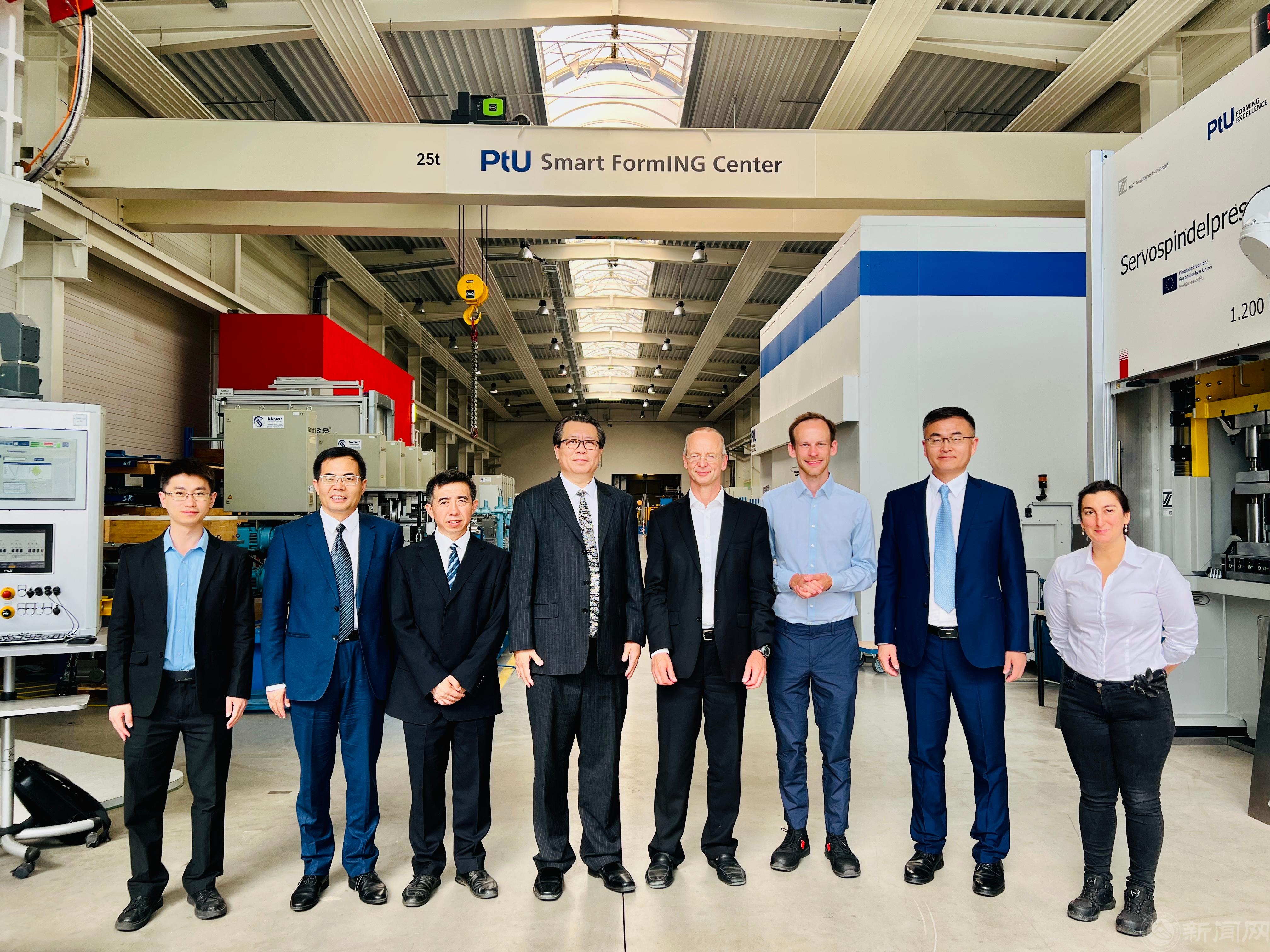 7月8日,代表团访问了达姆施塔特工业大学制造工程与成形装备研究院。德国达姆施塔特工业大学(Technical University of Darmstadt)是德国著名理工科大学,德国卓越理工大学九校联盟成员,制造工程与成形装备研究院(Institute for Production Engineering and Forming Machines)是其所属研究机构。代表团与制造工程和成形装备研究院负责人德国国家科学与工程院院士Peter Groche教授等人深入交流了智能成形制造的学术前沿技术,参观了该研究院智能成形中心(Smart Forming Center)。双方回顾了两校辊弯成形研发团队的合作,并明确两校将继续在辊弯成形领域开展师生及科研的深入合作。