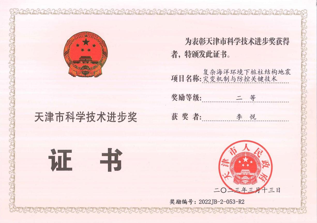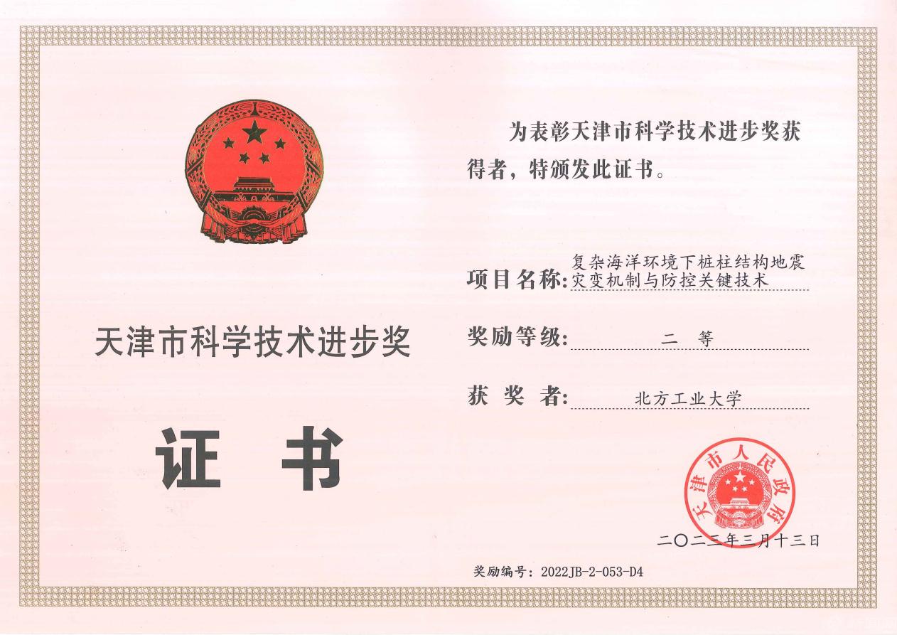 近日,2022年度天津市科学技术奖揭晓,beat365官网申报的“复杂海洋环境下桩柱结构地震灾变机制与防控关键技术”获得二等奖。