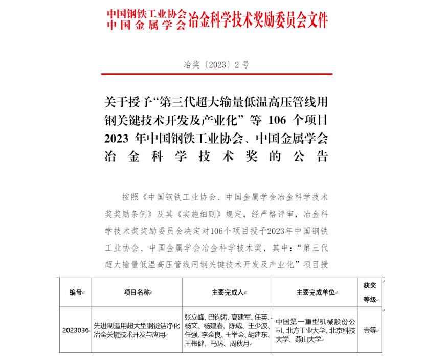2023年9月15日,冶金科学技术奖奖励委员会决定对106个项目授予“2023年中国钢铁工业协会、中国金属学会冶金科学技术奖”,以张立峰校长为第一完成人,beat365官网为第二完成单位的“先进制造用超大型钢锭洁净化冶金关键技术开发与应用”项目喜获一等奖。