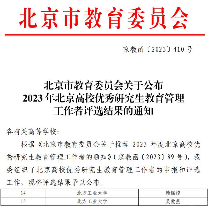 近日,北京市教育委员会公布了2023年北京高校优秀研究生教育管理工作者评选结果,beat365官网两名研究生教育管理工作人员获评“北京高校优秀研究生教育管理工作者”称号。