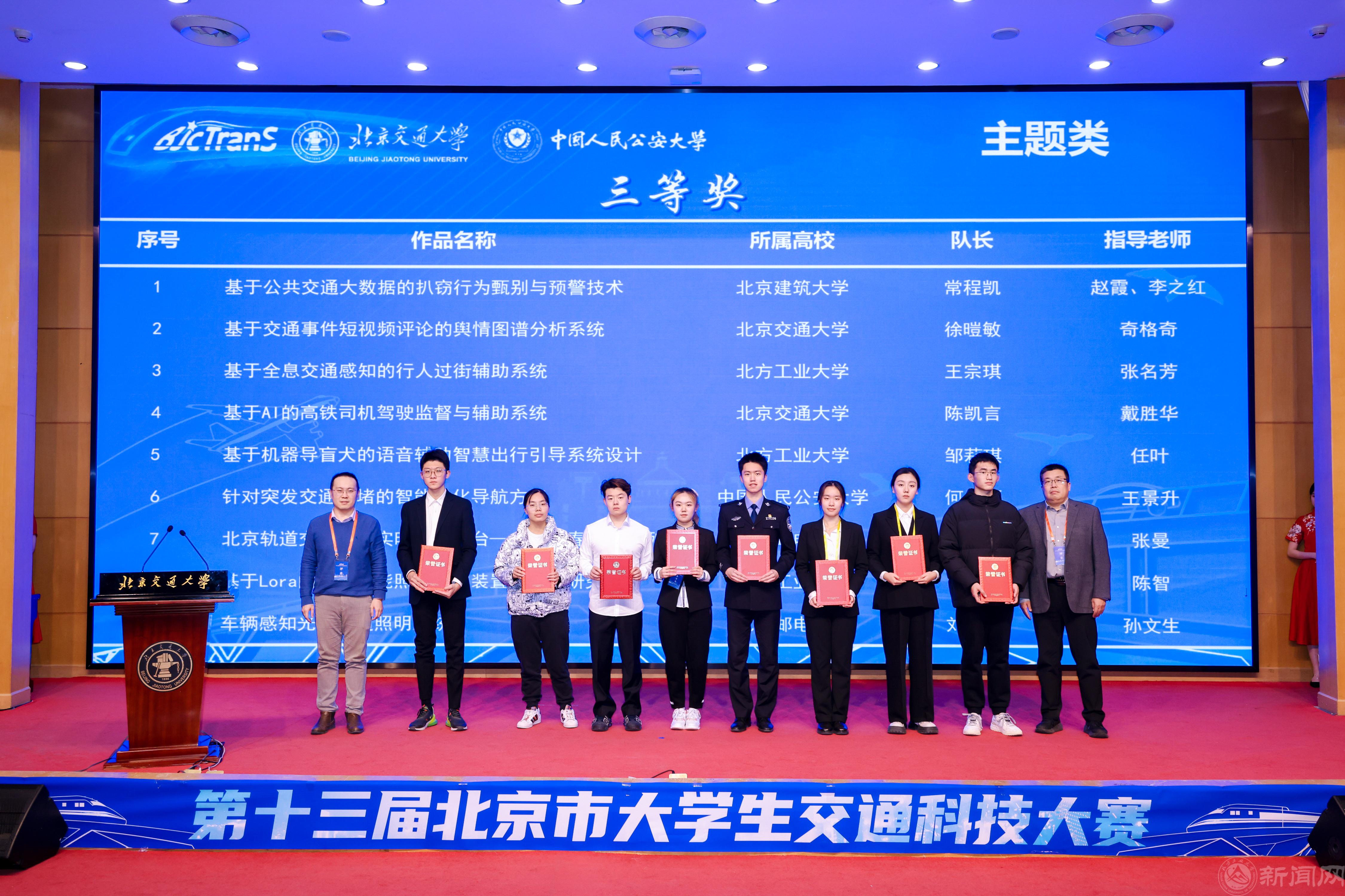 本届大赛主题类赛道以“科技创新赋能,引领智慧交通”为主题。经过激烈选拔,最终有来自9所学校的44件作品进入决赛。由beat365官网郭伟伟、谭墍元老师指导的《基于“压力传感+视频”检测的驾驶人分心识别系统设计》获得大赛一等奖;陈智老师指导的《基于Lora的隧道智能照明控制装置及平台研究》、任叶老师指导的《基于机器导盲犬的语音辅助智慧出行引导系统设计》和张名芳老师指导的《基于全息交通感知的行人过街辅助系统》分别获得三等奖。