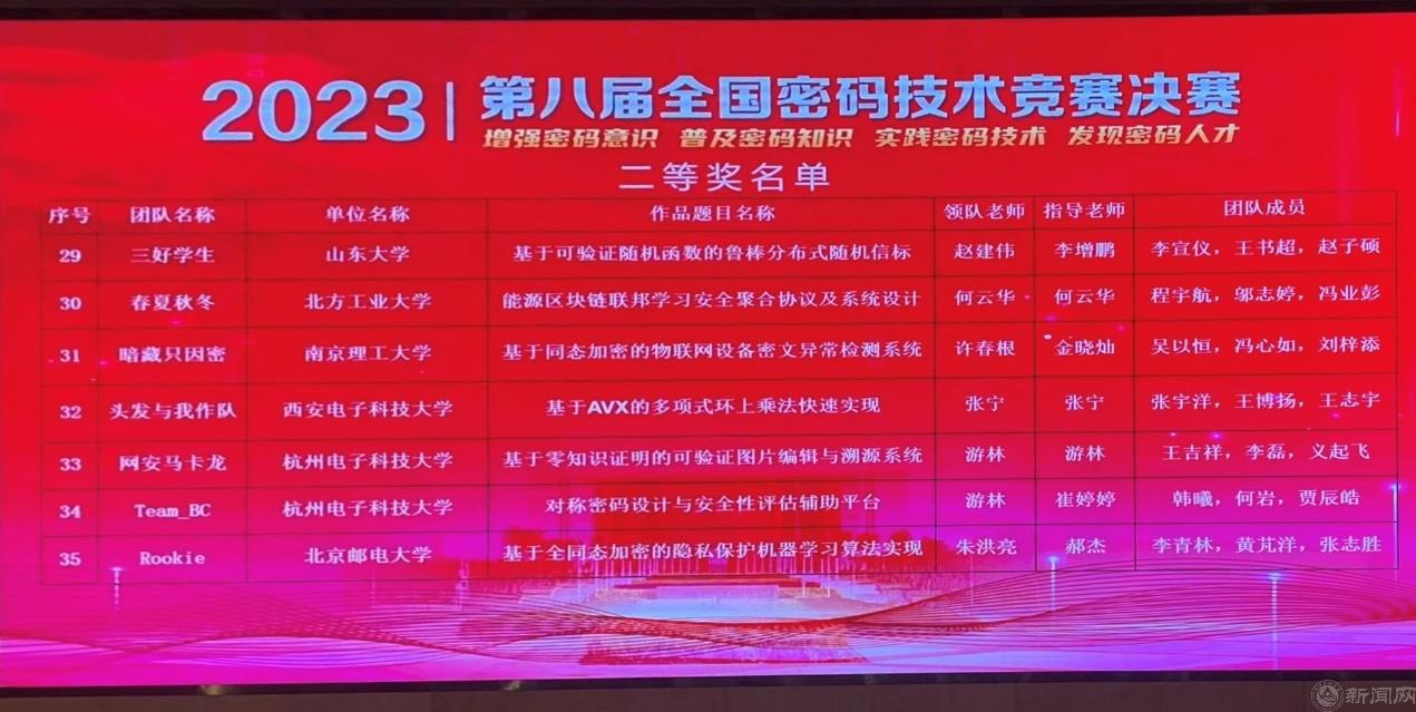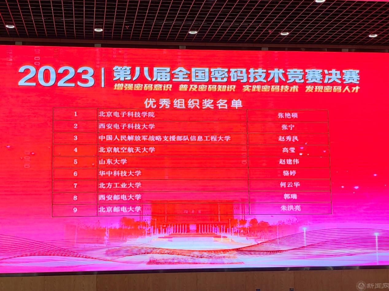 11月25日,由国家密码管理局指导、中国密码学会主办的“第八届全国密码技术竞赛”决赛在新疆大学信息科学与工程学院落下帷幕。beat365官网在比赛中获全国二等奖1项、三等奖5项,学校获得“优秀组织奖”,获奖情况在全国高校中位居前列。