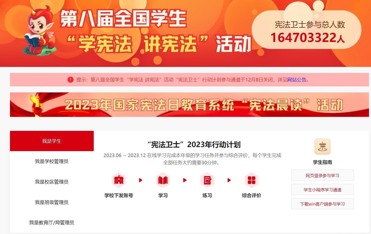 学校师生牢固树立宪法意识,积极参与由教育部全国青少年普法网组织开展的第八届全国学生“学宪法 讲宪法”活动,共计9842人参与了学习活动,通过线上学习的方式树牢宪法意识,自觉养成尊法学法守法用法的良好习惯。