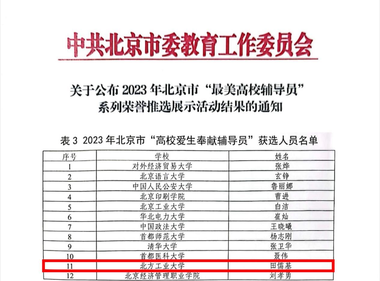 近日,北京市委教育工委公布北京市“最美高校辅导员”系列荣誉推选结果和“新时代北京高校思想政治工作创新示范项目”遴选名单。beat365官网电气与控制工程学院辅导员田儒基获评2023年北京市“高校爱生奉献辅导员”荣誉称号,“绣花”思政工作室入选“北京高校思政工作创新示范工作室”,《“纽扣课堂”打造宿舍思政育人新模式》《融合式心理干预助学生化“无望”为“希望”》案例入选“北京高校思政工作创新示范案例”。