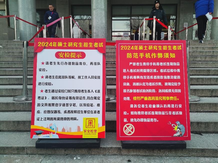 针对本年度对安检等环节提出的新要求,学校提前通过研究生院微信公众号、网站等,向考生推送物品寄存方法与注意事项、安检要求、考场分布和入校时间,帮助考生快速顺畅进行物品寄存、安检、入场。