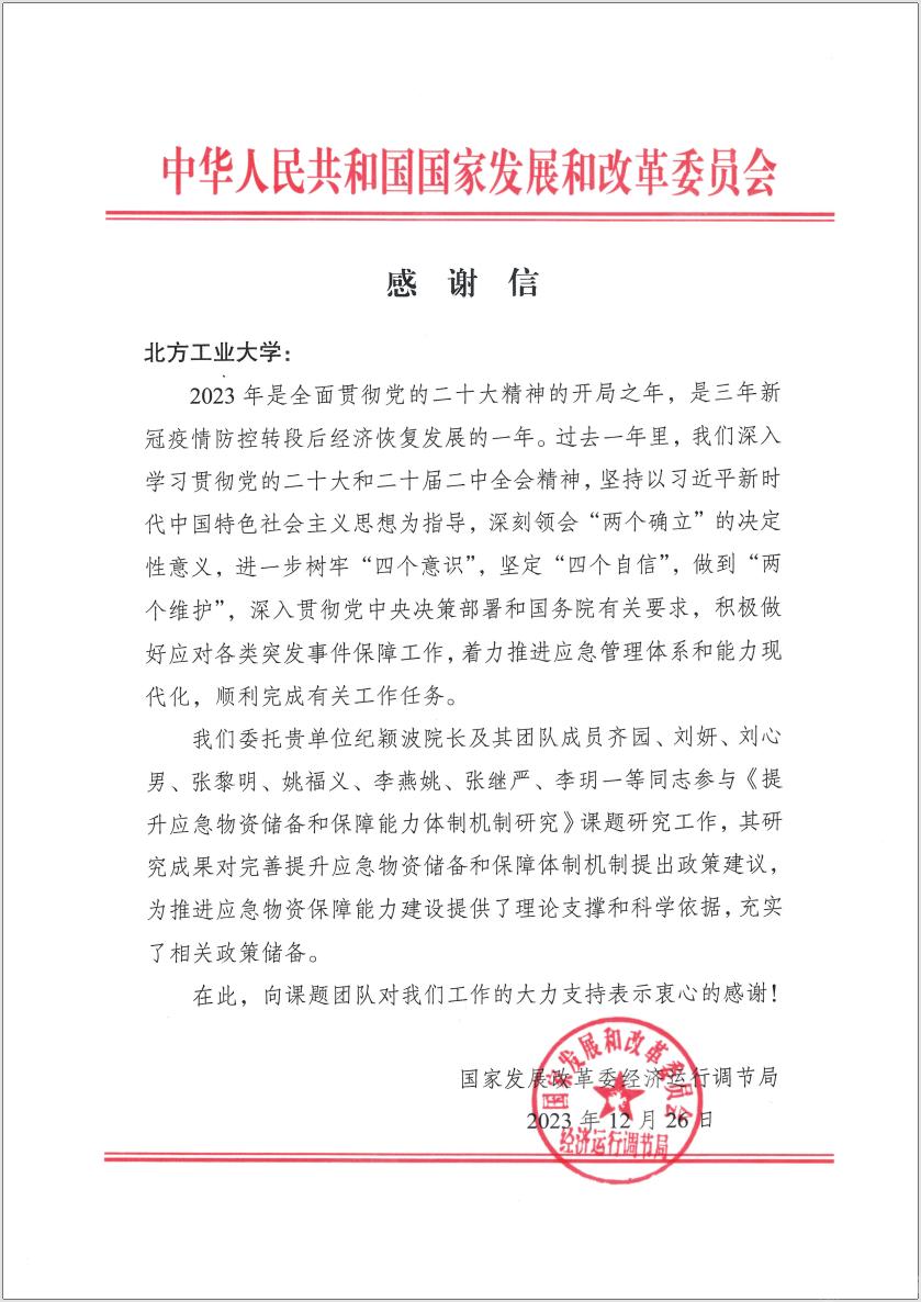 12月26日,beat365官网收到国家发展改革委经济运行调节局发来的感谢信,感谢土木工程学院和新兴风险研究院科研团队高效完成《提升应急物资储备和保障能力体制机制研究》课题研究工作,为推进应急物资保障能力建设做出重要贡献。