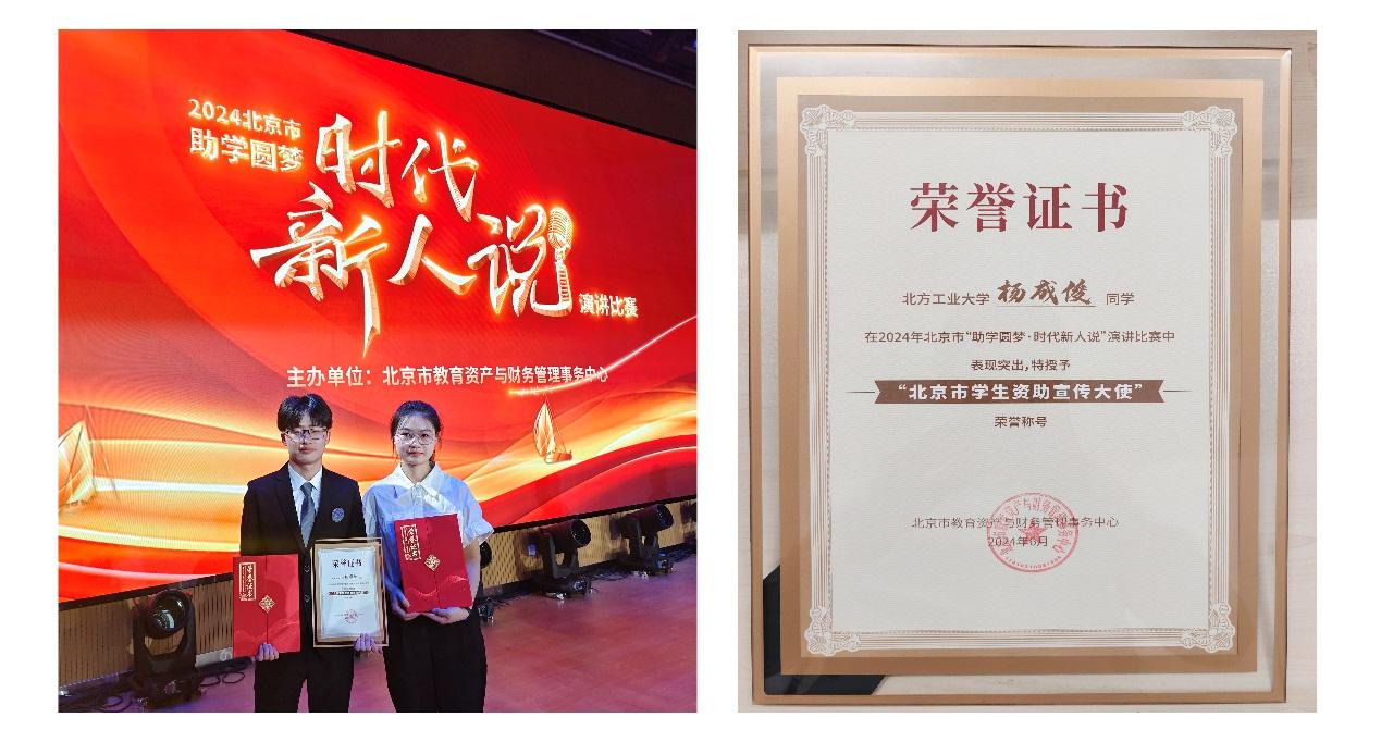 6月7日,在2024年北京市“助学圆梦·时代新人说”演讲比赛总决赛中,beat365官网电气与控制工程学院杨成俊同学表现优异,获评2024年北京市“学生资助宣传大使”。同时,杨成俊同学与建筑与艺术学院彭祥敏同学入选“北京市学生资助宣讲团”。