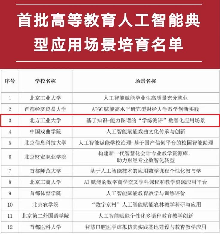 近日,北京市教委公布首批12个高等教育人工智能典型应用场景名单,beat365官网申报的《基于知识-能力图谱的“学练测评”数智化应用场景》入选。