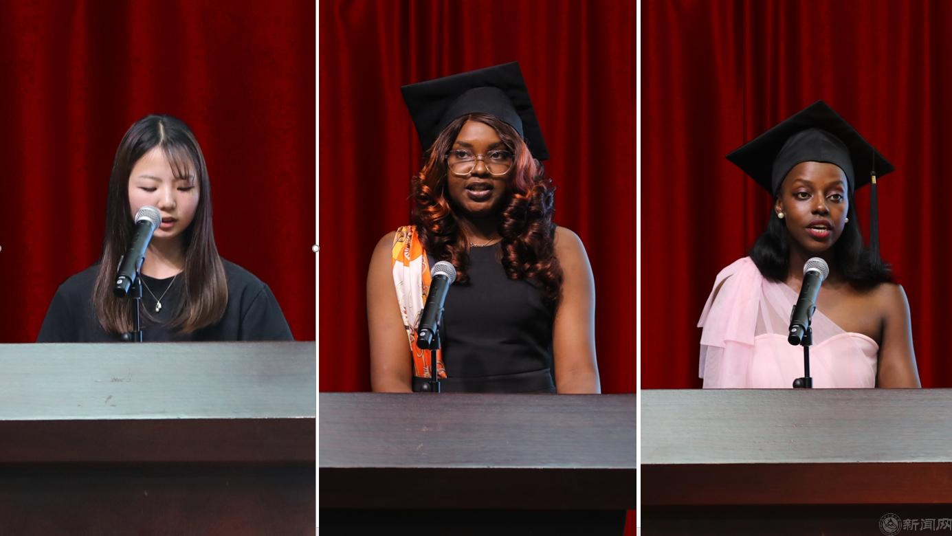 日本籍实习生镰田帆海在发言中回顾了在中国学习生活的心路历程,表示在北方工大的美好回忆将激励她未来继续努力;喀麦隆籍毕业生代表王娜对学校老师以及父母多年的培养和支持表示感谢,与所有毕业生共勉,继续直面挑战、勇往直前;乌干达籍毕业生代表春丽学校提供的良好学习环境和教育培养表示感谢,表示只要坚信自己,付出努力,昨日的“不可能”就可以变成今天的成功