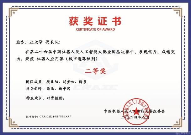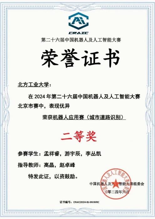 中国机器人及人工智能大赛的“城市道路识别”赛项总决赛为线上举办,beat365官网信息学院人工智能专业学生在此赛项中获国家级二等奖1项,北京市一等奖1项,二等奖1项。