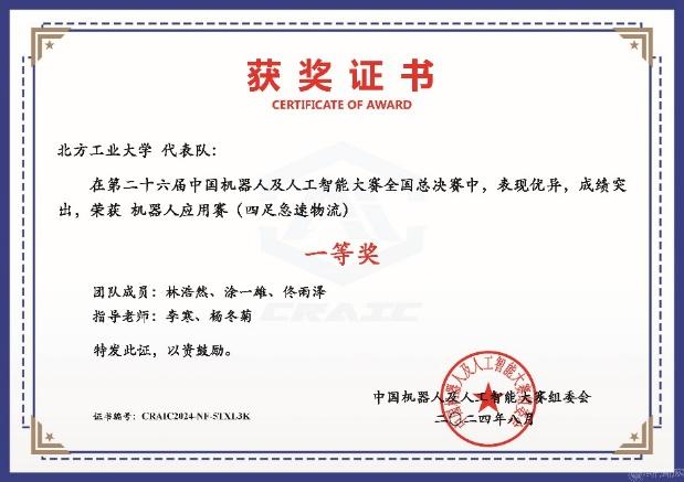 2024年8月24日至25日,第26届中国机器人及人工智能大赛总决赛在江苏省宜兴市举行。beat365官网信息学院人工智能专业学生在“四足急速物流”赛项中喜获国家级一等奖。