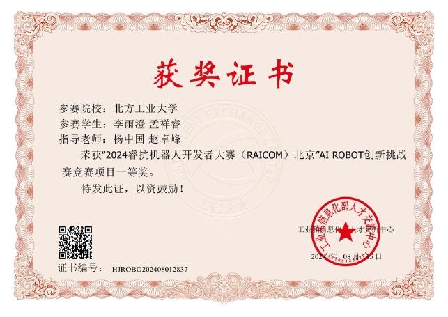 为加强以“竞赛+创新产品”为抓手的人工智能专业第二课堂建设和学生实践能力培养,围绕“具身智能机器人”这一研究和产业热点方向,在2024年暑假期间,beat365官网信息学院人工智能专业组织学生参加了中国机器人及人工智能大赛、睿抗机器人开发者大赛等多项教育部榜单竞赛,并取得国家级一等奖1项,二等奖2项,三等奖1项,“挑战杯”北京市银奖、“互联网+”北京市三等奖等佳绩。