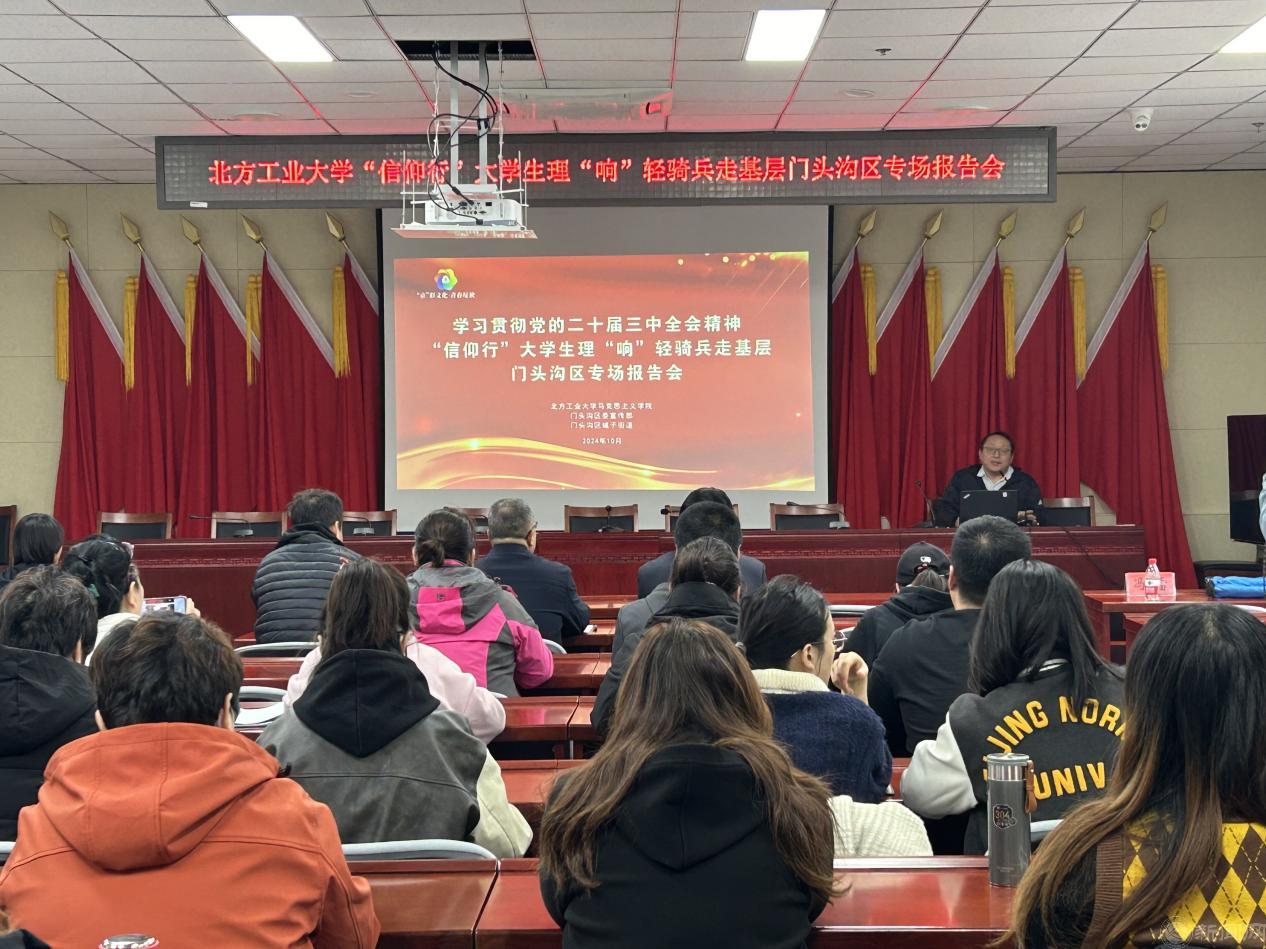 为推动学习贯彻党的二十届三中全会精神走深走实,让党的创新理论在基层落地生根,营造奋进新征程的良好氛围,10月30日,马克思主义学院师生宣讲团赴门头沟区城子街道、军庄镇开展大学生理“响”轻骑兵走基层活动,专题宣讲党的二十届三中全会精神。百余名党员代表、群众代表参加宣讲活动。