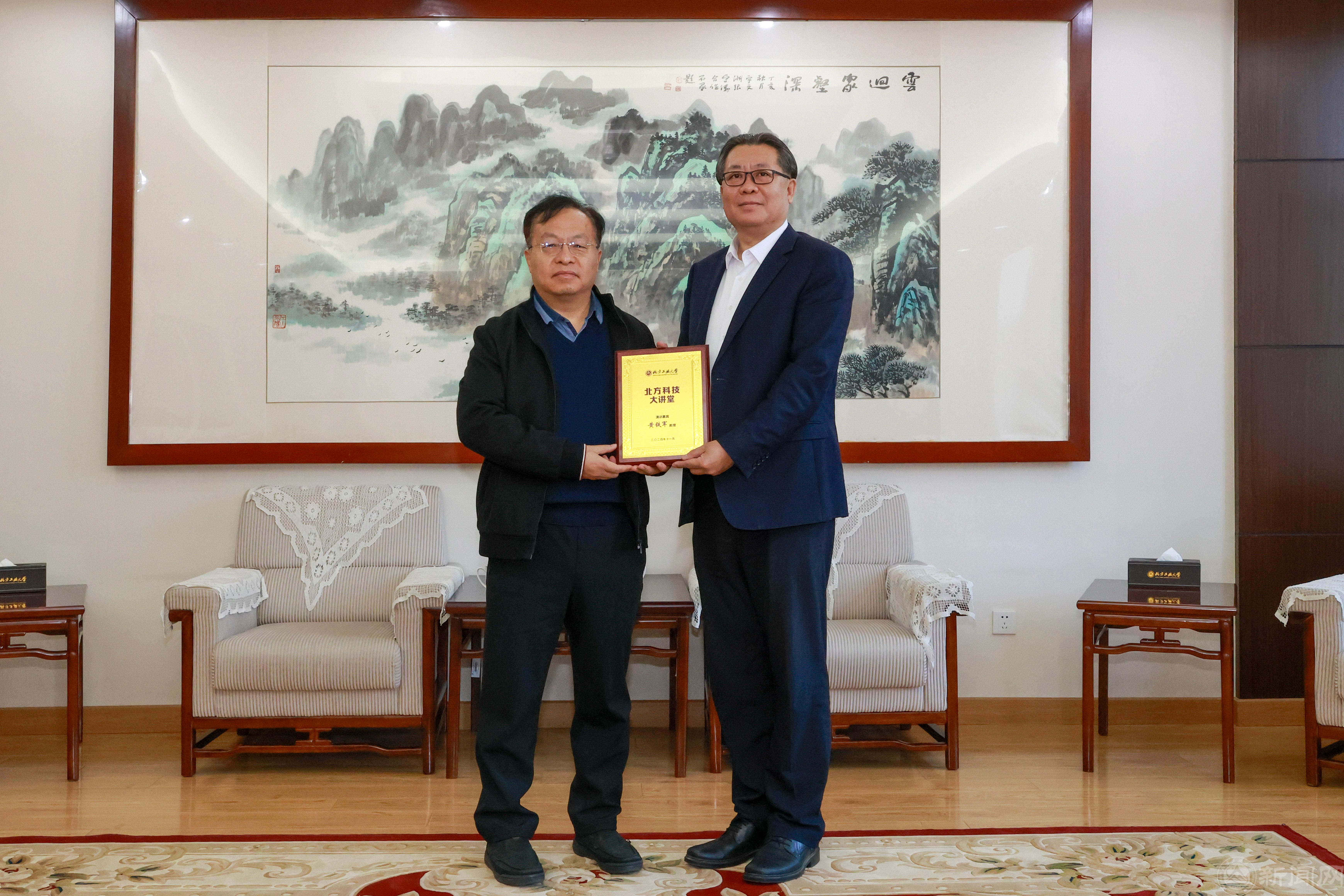 报告会前,党委副书记、校长张立峰,党委常委、副校长李全明与黄铁军教授进行了亲切交流。张校长向黄教授介绍了学校概况和近年来的发展成就,诚挚邀请黄教授关注支持学校人工智能领域的学科建设与发展,并为其颁发了北方科技大讲堂纪念铭牌。