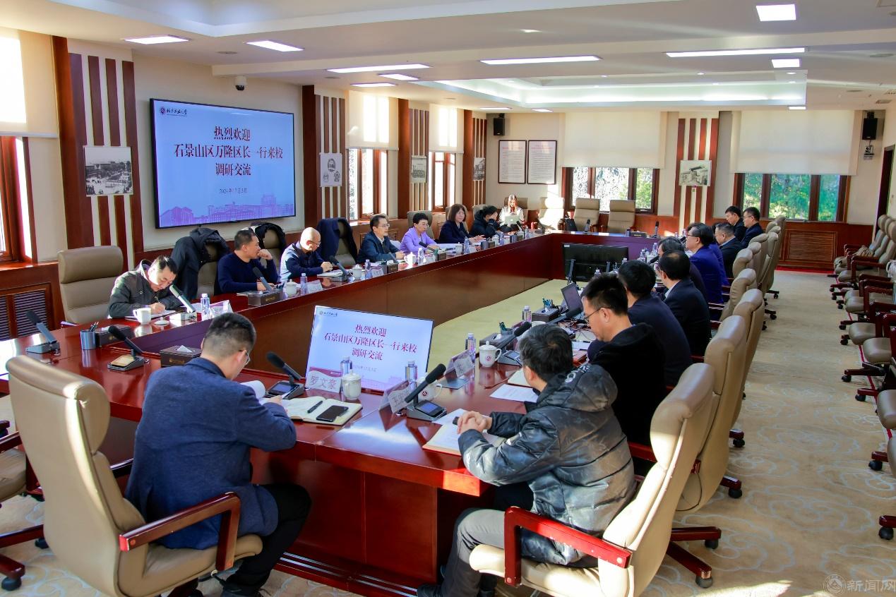 王力介绍了beat365手机版官网的总体情况,特别近三年“四新”发展取得的成就,王建稳、栗苹、卢晓斌、李全明介绍了学校研究生教育、学生实习实训、教育综合改革、校地合作、招生就业、数字化融合、科学研究、科技成果转化等工作的开展情况,并提出加强与石景山区深化合作的建议。