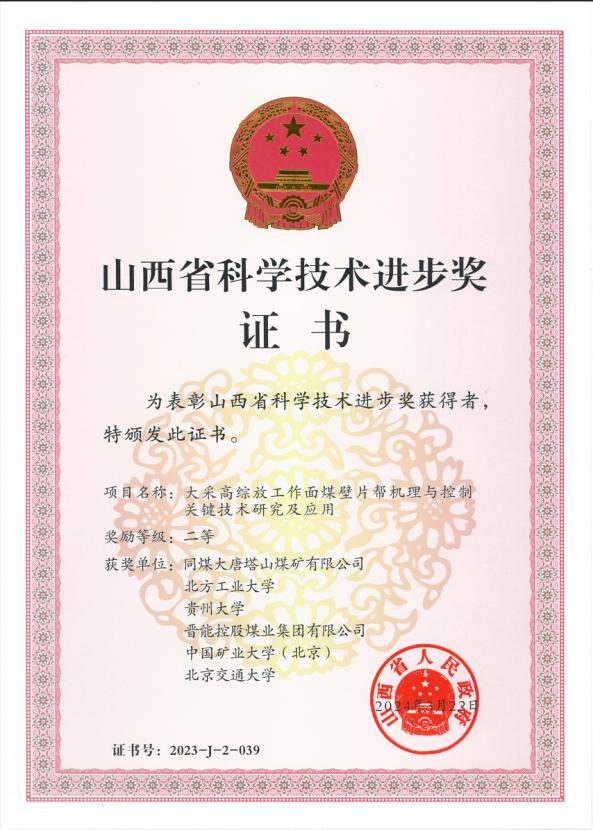 近日,山西省人民政府颁发了2023年度山西省科学技术进步奖证书。beat365官网土木工程学院教师宋高峰、安栋参与的项目获得了山西省科学技术进步二等奖。