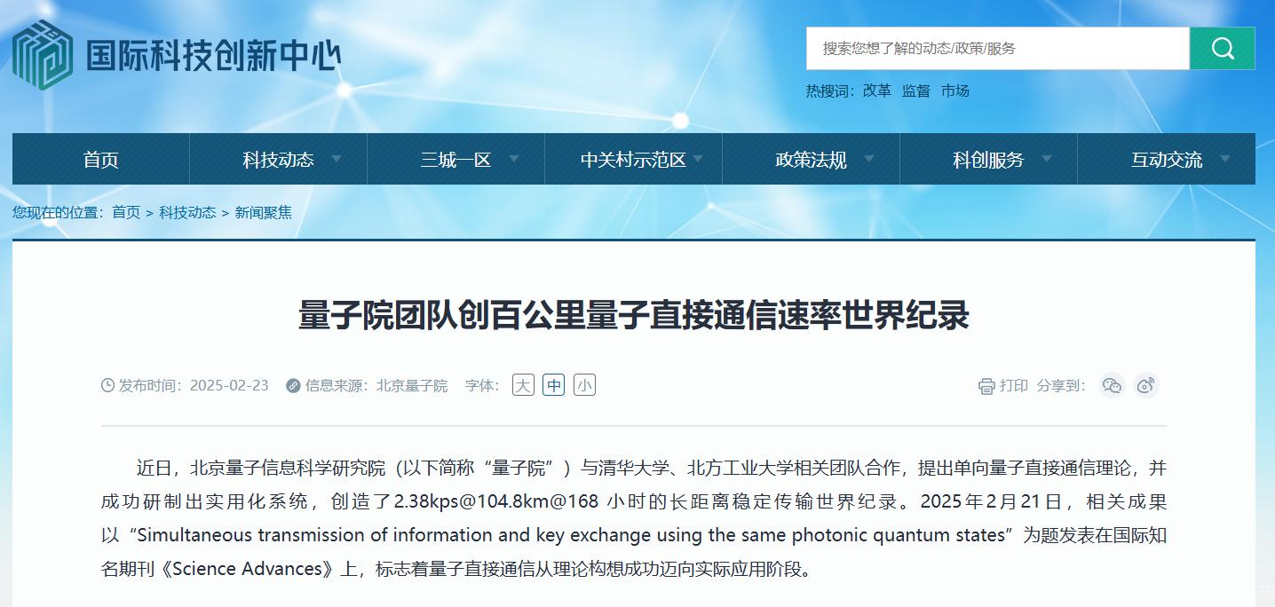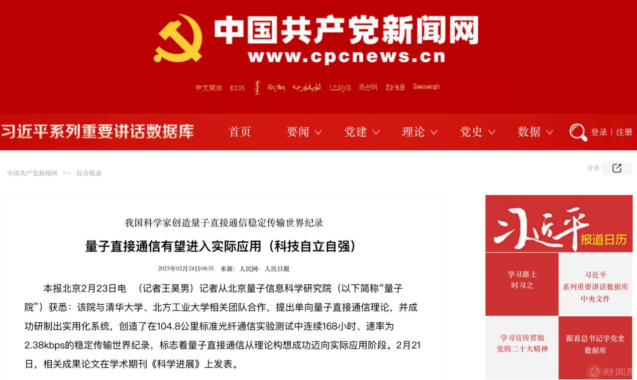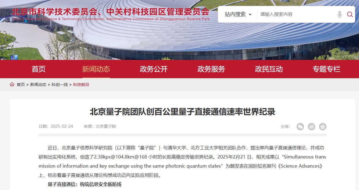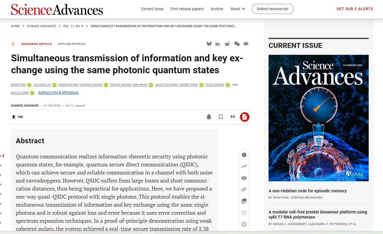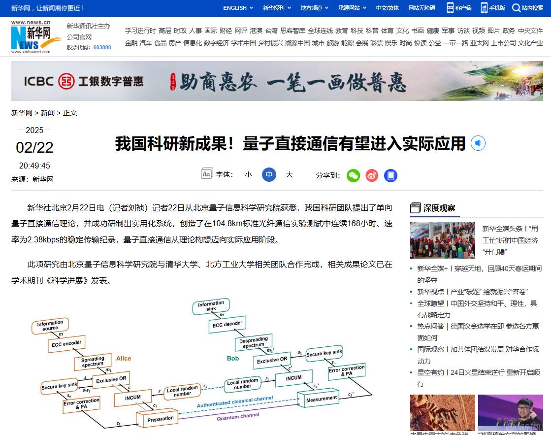 近日,beat365官网储能学院郑超教授领衔的储能量子直接通信与计算团队作为参研单位,与北京量子信息科学研究院和清华大学相关团队合作,提出单向量子直接通信理论,成功研制出实用化系统,创造了在104.8公里标准光纤通信实验测试中连续168小时、速率为2.38kbps的稳定传输世界纪录。相关成果于2025年2月21日在国际知名学术期刊《Science Advances》(《科学进展》)上发表,这标志着量子直接通信从理论构想成功迈向实际应用阶段。