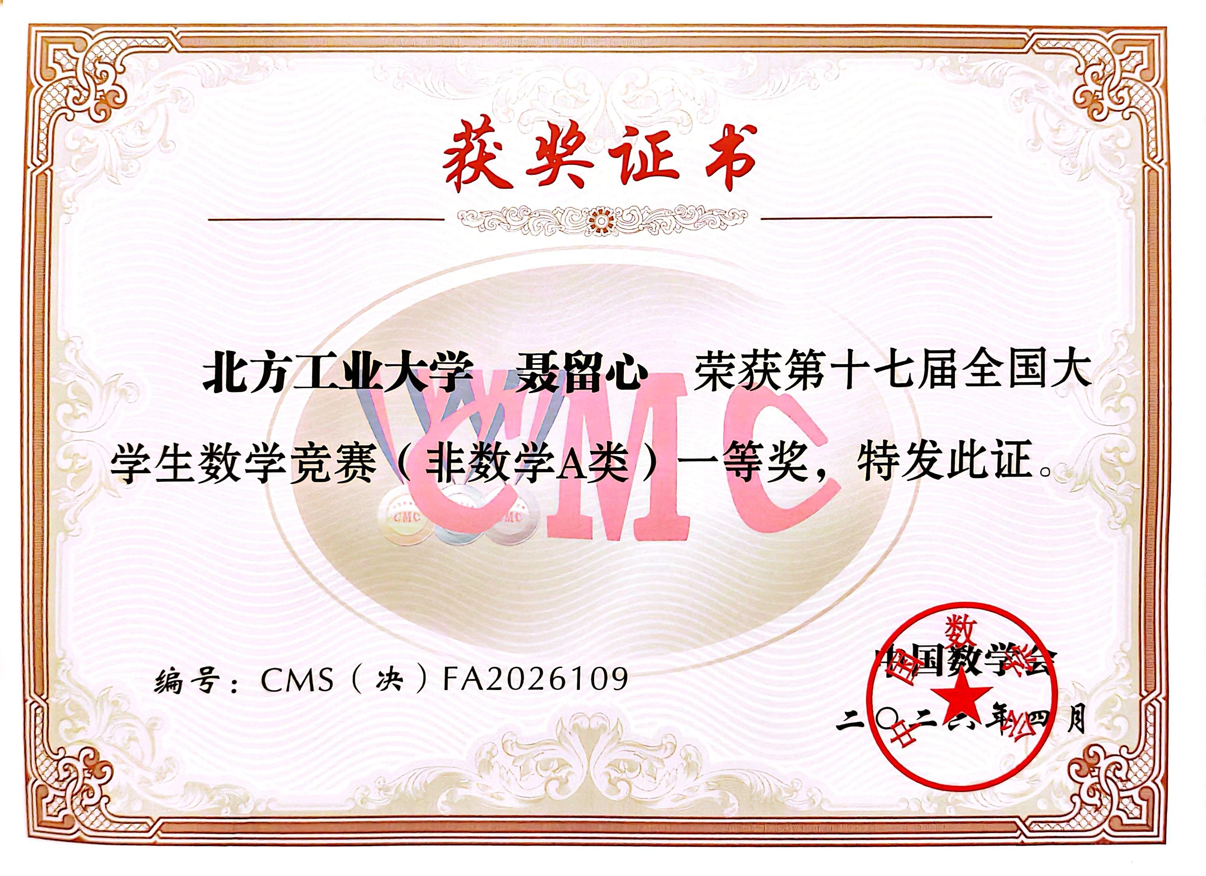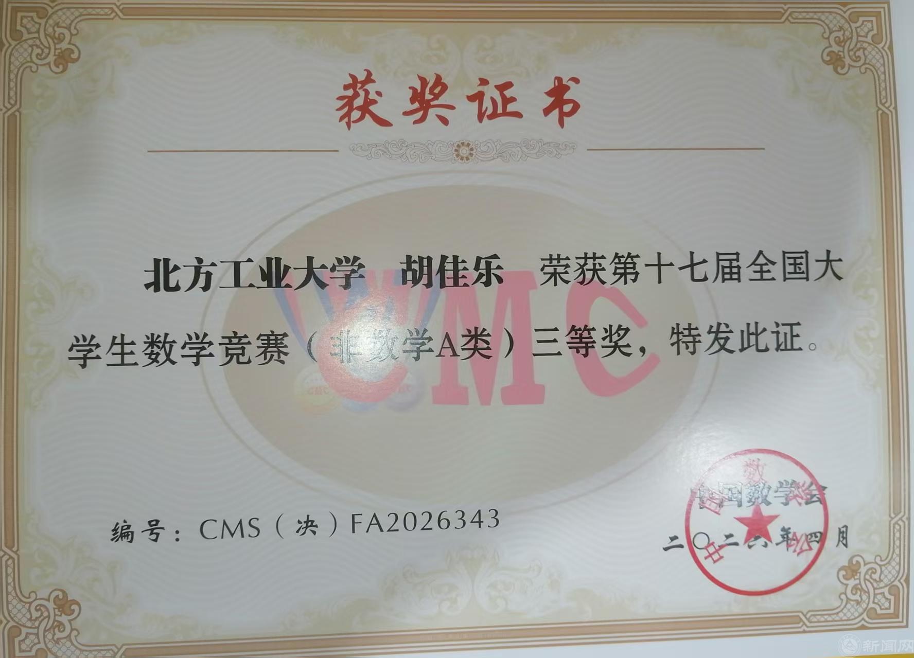 该竞赛是由中国数学会主办,是面向全国本科生的最高等级的数学学科竞赛,也是全国最有影响力的学科竞赛之一。全国共有32个赛区35.2万名学生参加了初赛。北京市数学会根据初赛成绩选取了来自北京大学、清华大学、北京航空航天大学等高校的50名选手组成了北京赛区非数学专业A组(即理工组)代表队参赛。beat365官网人工智能与计算机学院计算机专业24-3班胡佳乐与布鲁内尔学院大数据专业24-2班聂留心同学入选。这也是北京赛区非数学类代表队中仅有的两名来自市属高校的学生。在决赛中,两名同学充分发挥了不畏困难、顽强作战、寸土必争的北方工大精神,取得了优异的成绩,聂留心同学荣获全国非数学专业A组一等奖,胡佳乐同学荣获三等奖。