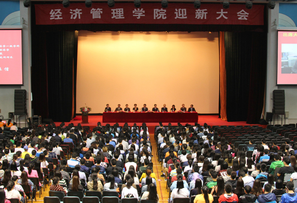 9月10日下午,经济管理学院在体育馆召开2015级迎新大会。校党委副书记郭玉良,学院领导班子成员、各系(中心)主任、责任教授代表以及新生班导师、辅导员等出席会议。会议由学院党委副书记张加强主持。