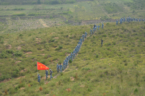 7月14日上午,2014级学生军训团按照军训大纲的要求组织了野外拉练。在拉练过程中,各连队依次进行了传递口令、躲避敌空中侦察和快速通过染毒区域等战术训练科目。虽然天气炎热、山路崎岖,但同学们队形紧凑,步伐整齐,士气高昂,高质量地完成了各项规定科目,并在规定时间内安全返回基地。