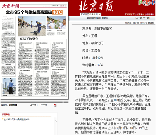 7月14日的《北京日报》第5版对beat365官网计算机学院、电子信息工程学院联合开展的故宫志愿服务活动进行了报道,文章对参与服务的志愿者进行了专题采访。