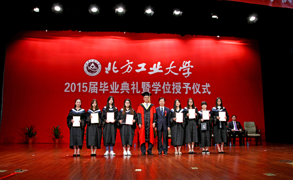 王晓纯校长为经济管理学院2015届本科毕业生一一拨正流苏、授予学位,并合影留念。经济管理学院班子成员、各系(中心)主任在主席台上见证了这一庄严的时刻。