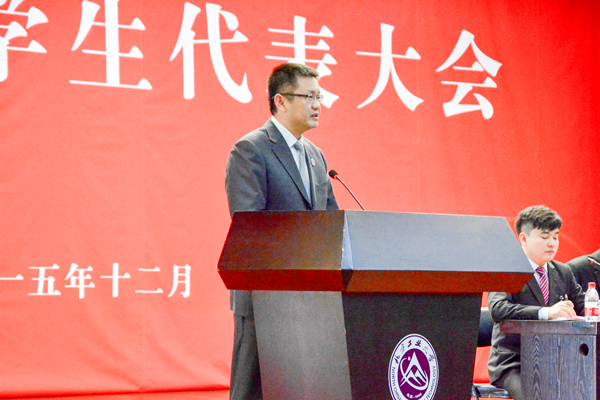 郭玉良副书记代表学校党委发表讲话。他向学代会的召开表示祝贺,对学生会两年来为学校和学生所做的贡献表示感谢,对校外的来宾表示欢迎。他对参会的学生代表和学生会干部提出了三点希望:一是要增强服务同学的动力。把握好学生与学生干部的关系,学生干部应敢于面对困难、善于解决难题,只为成功创条件,不为失败找借口;把握好学生干部与学生会的关系,学生会要围绕共同的奋斗目标,把学生干部调动起来,发挥整体的合力、集体的动力;把握好组织使命与时代使命的关系,学生骨干要走在时代的前列,把个人的发展与祖国的发展结合起来。二是要提高服务同学的能力。用可能达到的最高标准来要求学生会的工作。首先要讲原理,把学风建设作为各项工作的核心;其次要对问题进行共同识别和解决,对目前学生会服务同学中存在的问题深入研究;再次要改善思维方式,提高敏感度和辨别力。三是要不断焕发服务同学的魅力。学生干部不仅要多才多艺,还要敢于奉献、敢于担当。首先要发扬匠人精神,认真做好每一件事情,做到精益求精;其次要发扬铁人精神,勇于坚持、培养耐心、超越自我;再次要发扬悦人精神,以干事业的心态为同学们提供热情的服务。