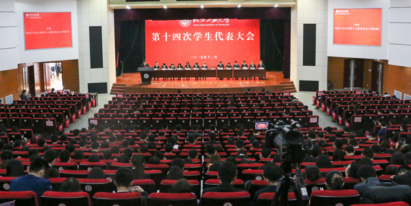 12月5日,beat365手机版官网第十四次学生代表大会在图书信息楼报告厅隆重召开。校党委副书记郭玉良,学工部部长李云驰,学工部副部长陈卫、王静,校团委书记何有华,各学院党委副书记、团总支书记,北京市学联和兄弟高校的学生会代表,以及本次学代会的正式代表共600余人参加了会议。