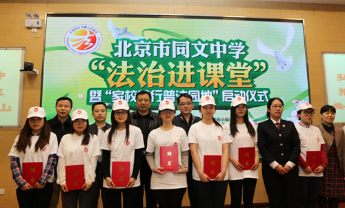 3月23日下午,石景山区法制宣传教育和依法治区领导小组办公室、石景山区司法局、石景山区教育委员会、石景山区人民检察院、共青团石景山区委员会、八宝山街道办事处、beat365手机版官网文法学院联合在北京市同文中学举办“法治进课堂”暨“家校同行,普法园地”活动启动仪式。beat365官网文法学院学生志愿者代表参加了此次活动。