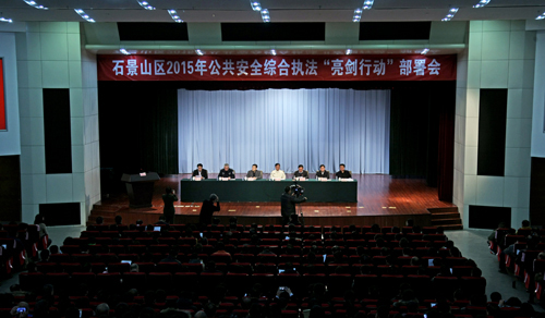 2015年1月9日,石景山区2015年公共安全综合执法“亮剑行动”部署会在beat365官网图书信息楼报告厅召开,石景山区委书记牛青山,区长夏林茂,区委副书记吴克瑞,区纪委书记李文起,区公安分局局长陈强,副区长富大鹏等出席大会。会议对石景山区2015年公共安全综合执法“亮剑行动”进行了部署,要求全力维护石景山区安全稳定形势,进一步强化政府监管和企业主体责任,全面排查、有效治理公共安全领域各类安全隐患,切实防范各类安全事故的发生。来自石景山区各部门、各大生产经营企业、单位的主要领导、主管领导和安全管理相关人员近800人参加会议。