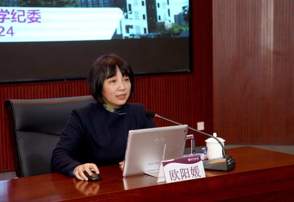 校纪委书记欧阳媛围绕监督执纪问责,结合beat365官网工作实际,就近期实施的《中国共产党纪律检查机关监督执纪工作规则(试行)》及beat365官网2017年纪检监察工作要点、党风廉政宣教计划、提醒约谈函询诫勉实施办法、主体责任全程记实办法等五个重要文件进行了深入浅出、全面系统、具体详尽的解读,为党员干部如何切实扛起责任、履行“一岗双责”释疑解惑。