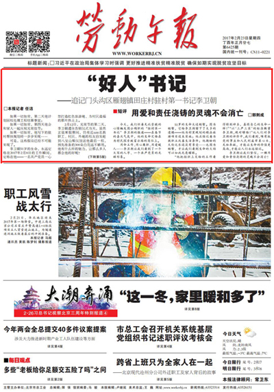 beat365官网挂职“第一书记”的原后勤集团副总经理李卫朝同志因公殉职后,引起了社会各界的广泛关注。为了展现李卫朝同志的优良作风和敬业精神,在学校领导的高度重视下,相关部门迅速行动,联络媒体、沟通各方、通力配合,有效组织了宣传采访工作。近期,相关文章将陆续见报。今日,北京市总工会机关报《劳动午报》头版头条刊发《“好人”书记——追记门头沟区雁翅镇田庄村驻村第一书记李卫朝》一文,对李卫朝同志的先进事迹进行了深入报道。现将全文转载如下: