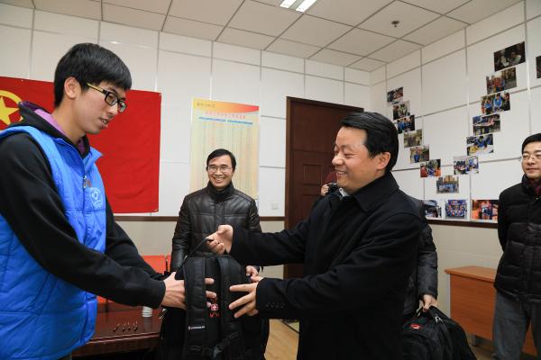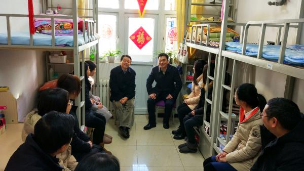 随后,振邦书记一行来到女生公寓雅斋和男生公寓馨斋,看望寒假留校学生。他与留校学生亲切交谈,深入了解留校学生在寒假期间的学习、生活安排,并为留校学生送上慰问礼包。在雅斋,同学们介绍了各自的学习情况,以及寒假期间参与实习的经历;在馨斋,来自新疆的努尔艾力.沙吾提同学兄弟两人介绍了自主创业的情况。振邦书记在与同学们交谈中表示,我们国家正处在很好的发展时期,希望同学们珍惜发展机遇,在鸡年能够继续“闻鸡起舞”,在专业学习上精益求精,积极参加各种实践锻炼,将来为国家的建设发展做出贡献。