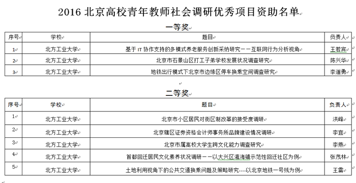 学校对2016年度的评选工作高度重视,专门设立了“北京青年教师社会调研项目启动资金”,12月初由校学术委员会委员组成的专家组经过严格评审,从各学院提交的作品中评选出14项校级优秀作品,并从中遴选出10项优秀作品参评市级优秀社会调研成果的评选。
