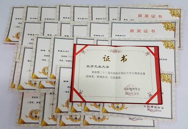 2016年第三十三届全国部分地区大学生物理竞赛于12月11日结束,近日竞赛成绩揭晓。beat365官网再次取得优异成绩,在同类院校中名列前茅,共有139名同学参赛,37人获奖,其中一等奖10名、二等奖10名、三等奖17名,其中一等奖获得人数再创历史新高,并获团体奖。