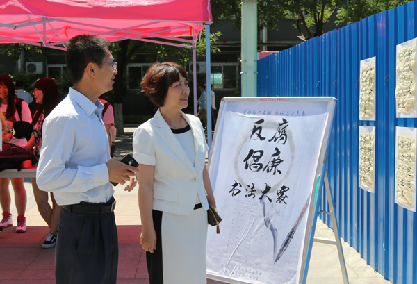 5月26日中午,由校团委主办、学生社团联合会承办的廉洁教育活动——手抄《中国共产党廉洁自律准则》学生书法大赛在毓秀广场拉开帷幕,校纪委书记欧阳媛、校党委副书记田红芳,以及各部门的领导到活动现场视察并参与投票。