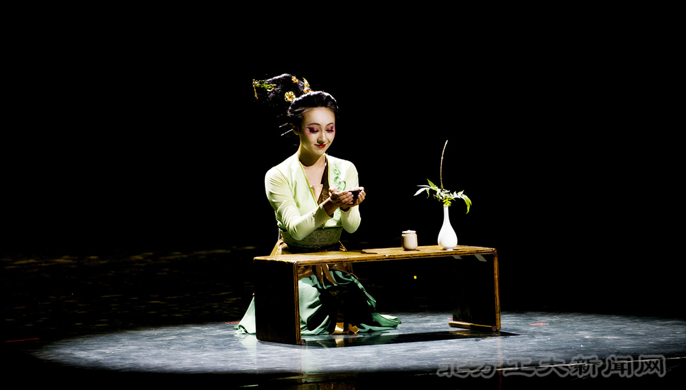 《佳茗行》采取行中有静、静中有行、虚实结合,不但表现出茶的灵魂更是把茶想象成了一个精灵,用抽象的方法从本质上来表现茶的特点,烘托出祥和宁静、高雅淡泊的气氛,侧重于一种意境的表现。作品选用了古典戏曲音乐与现代音乐结合,以简单素光的变幻、舞者优美的舞姿来烘托舞台画面感。