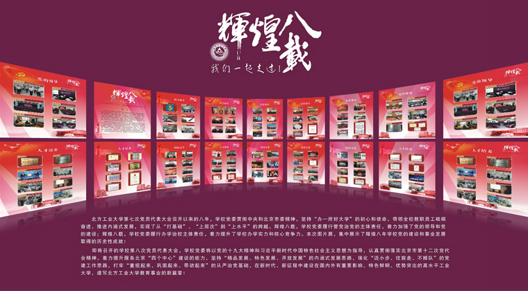 校党委宣传部于12月初举办了题为“辉煌八载,我们一起走过”的成就展,以图片的形式集中展示学校第七次党员代表大会以来八年的发展成就,并在网上推出展览电子版,以此激发北方工大人的自豪感、自尊心和自信心,为大会的召开营造良好氛围。