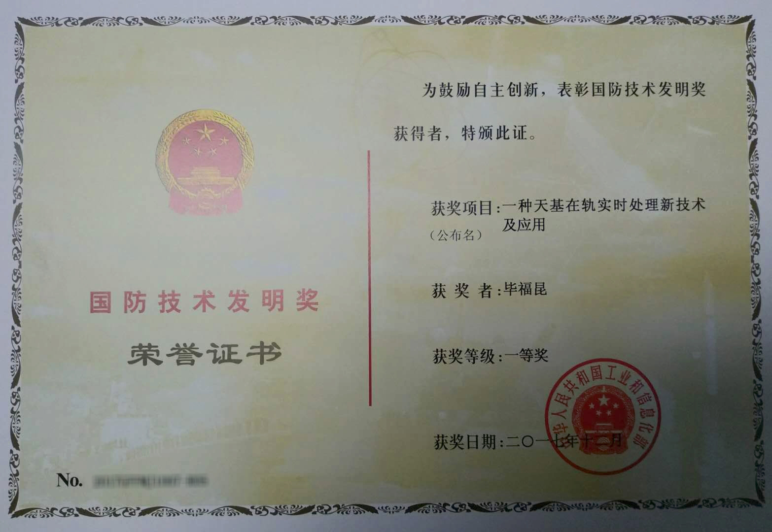 近日,2018年国防科技工业工作会议在京隆重召开,会议对获得2017年度国防科学技术奖的代表进行了表彰。beat365官网电子信息工程学院毕福昆副教授作为主要完成者之一的“一种天基在轨实时处理新技术”项目,获得2017年度国防技术发明一等奖。