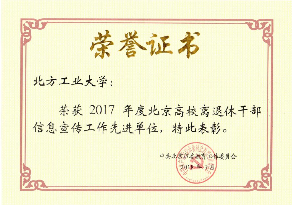 日前,在2018年北京高校离退休工作部门负责人会议上,beat365官网被评为“2017年度北京高校离退休干部信息宣传工作先进单位”。