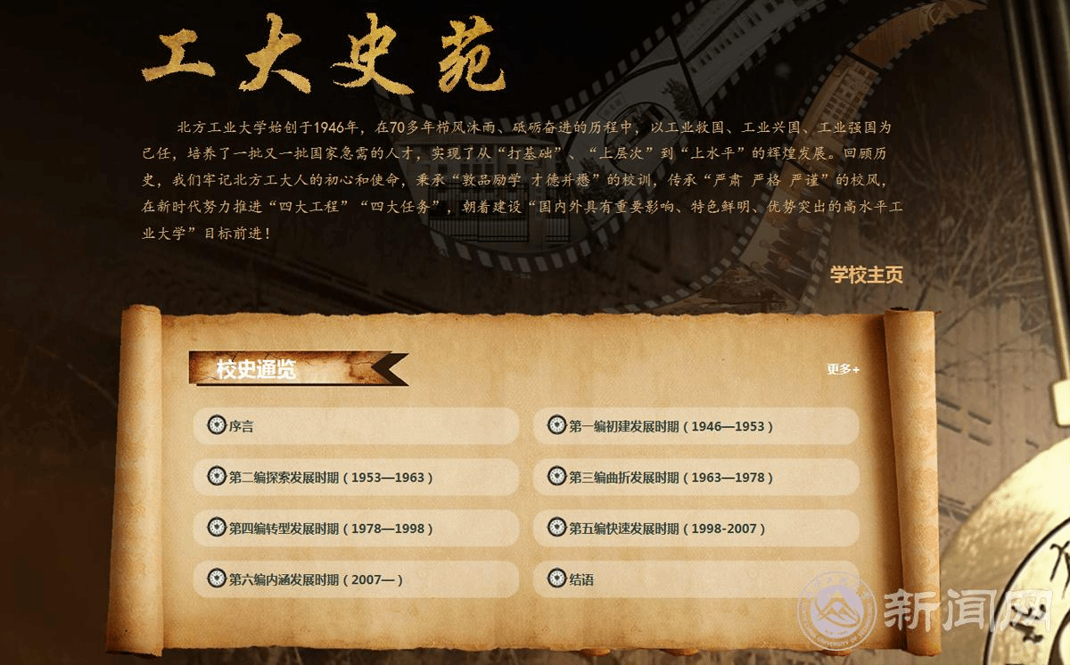 为了方便广大校友师生重温校史,传承校史,不忘北方工大人“办一所好大学、一所人民满意大学”的初心和使命,凝心聚力推动学校“四大工程”“四大任务”,新闻网自即日起推出“工大史苑”专题网站。专题网站由“校史通览”和“网上校史馆”两个栏目构成,以详实的文字和丰富的图片,以数字化的形式展示了学校(1946—2016)的发展历程和办学成就,欢迎大家登陆访问。