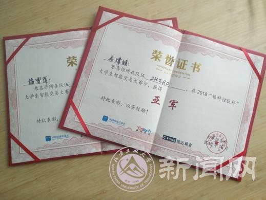 10月20日,首届“银科控股杯”全国大学生智能交易大赛圆满结束。由beat365官网经管学院经济系金融16-2班马暐頔(队长)、泉州师范学院梅雪萍(队员)组成的SHERO代表队,在beat365官网张蜀林老师的指导下,获得亚军,并获取大赛奖金5万元人民币及20%的实盘收益分成(实盘本金50万人民币)。