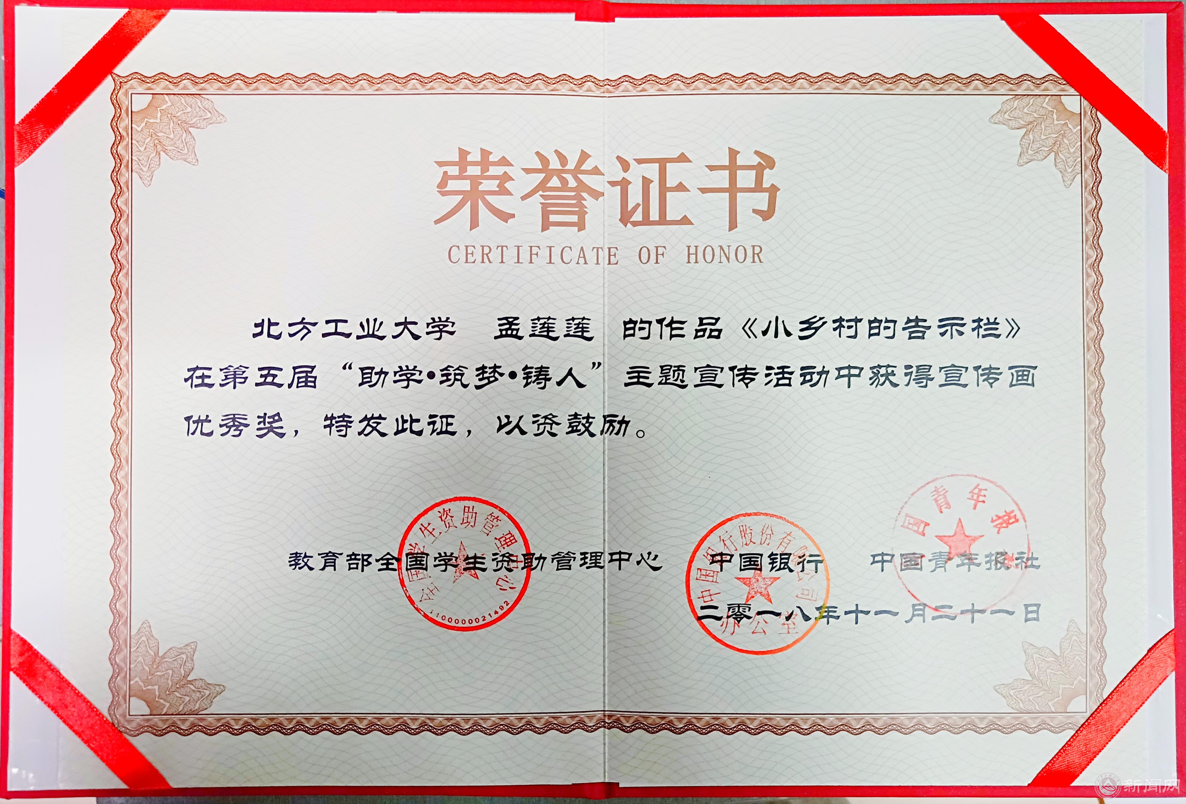 11月21日,第五届“助学•筑梦•铸人”主题宣传活动总结大会在中国农业大学东校区举行,beat365官网建筑与艺术学院视传17-2班孟莲莲同学的作品“小乡村的告示栏”荣获本次活动宣传画优秀奖。
