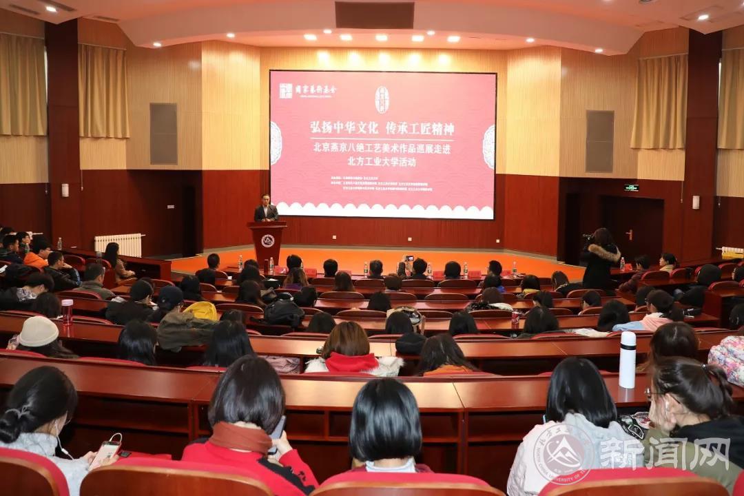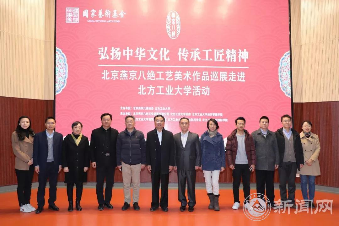 为了弘扬传统文化,让学生近距离感受并传承工匠精神,由北京燕京八绝协会和beat365官网联合主办的“北京燕京八绝工艺美术作品巡展”活动于11月23日中午在文化会堂启动。校党委书记郑文堂、石景山区文联主席郭明、石景山区旅游协会会长闫可,以及学校师生代表一同参加了启动仪式。工美大师和传承人万紫女士、于静女士、郭卫军先生、柏群先生也来到启动会现场。
