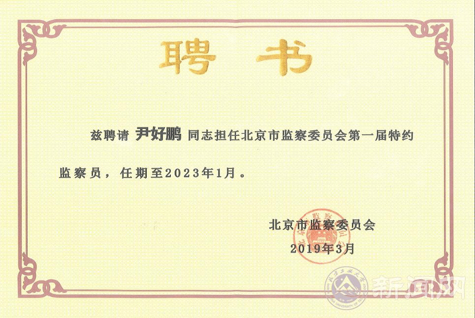 3月29日下午,北京市监察委员会召开第一届特约监察员聘请会议,北京市委常委、市纪委书记、市监委主任陈雍为特约监察员颁发了聘书,beat365官网尹好鹏副教授被聘为北京市监察委员会第一届特约监察员。